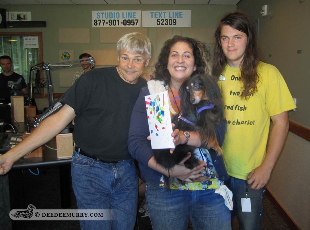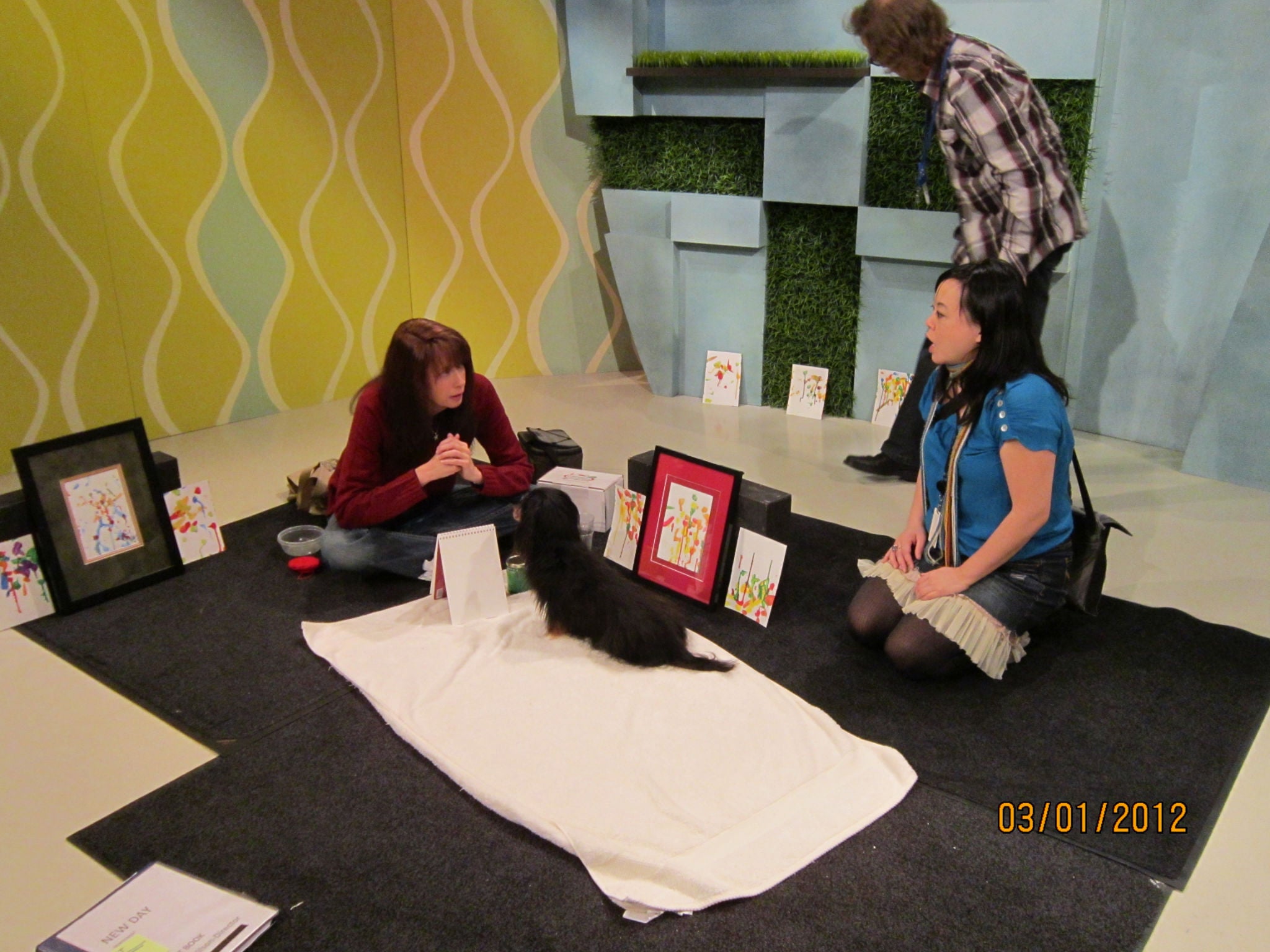Getting prepped on the set of Evening Magazine. Earlier as I was putting out her paints and towels I turned to see her trotting along at the heel of the stage crew headed for the food table.