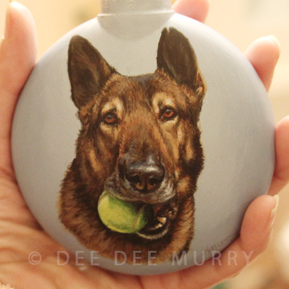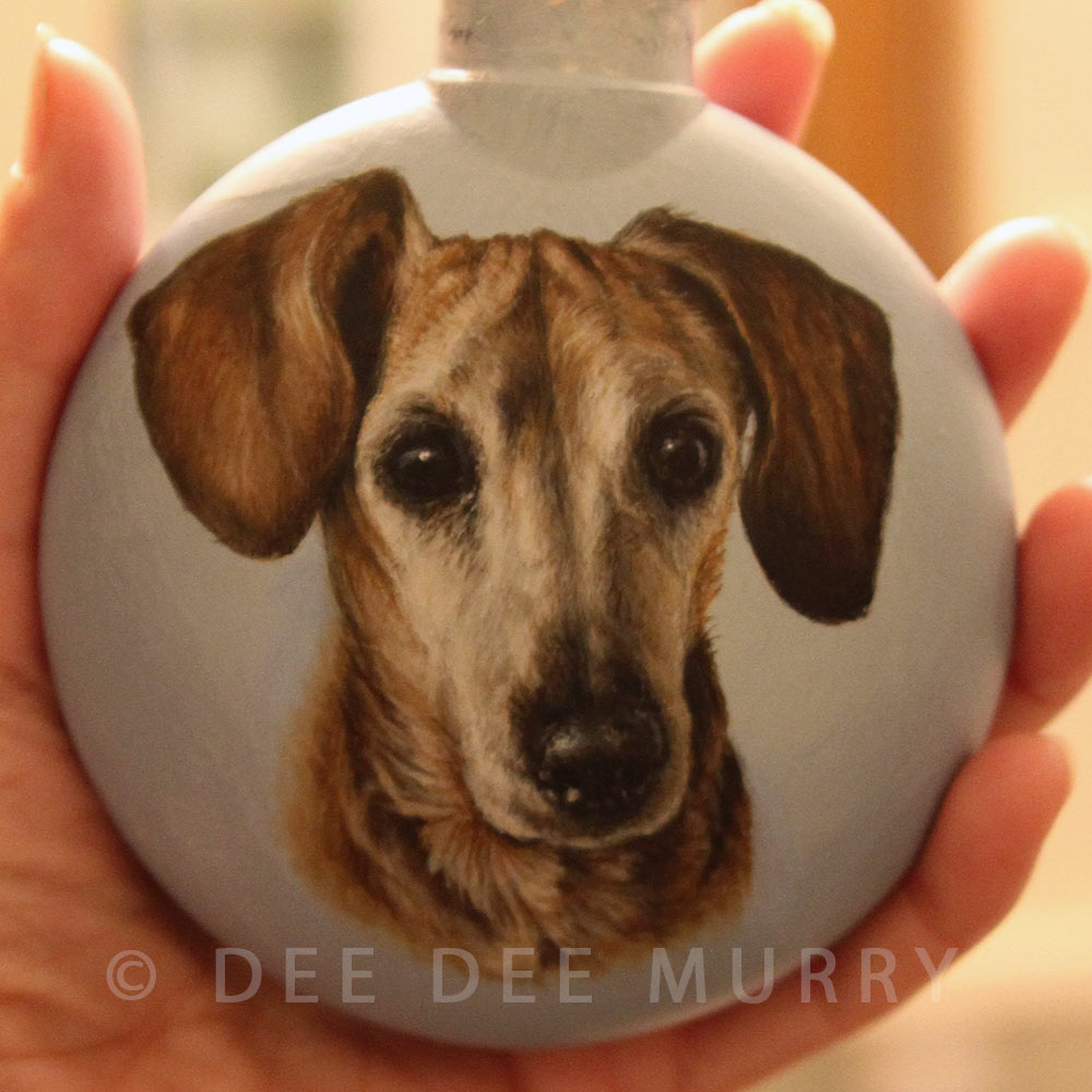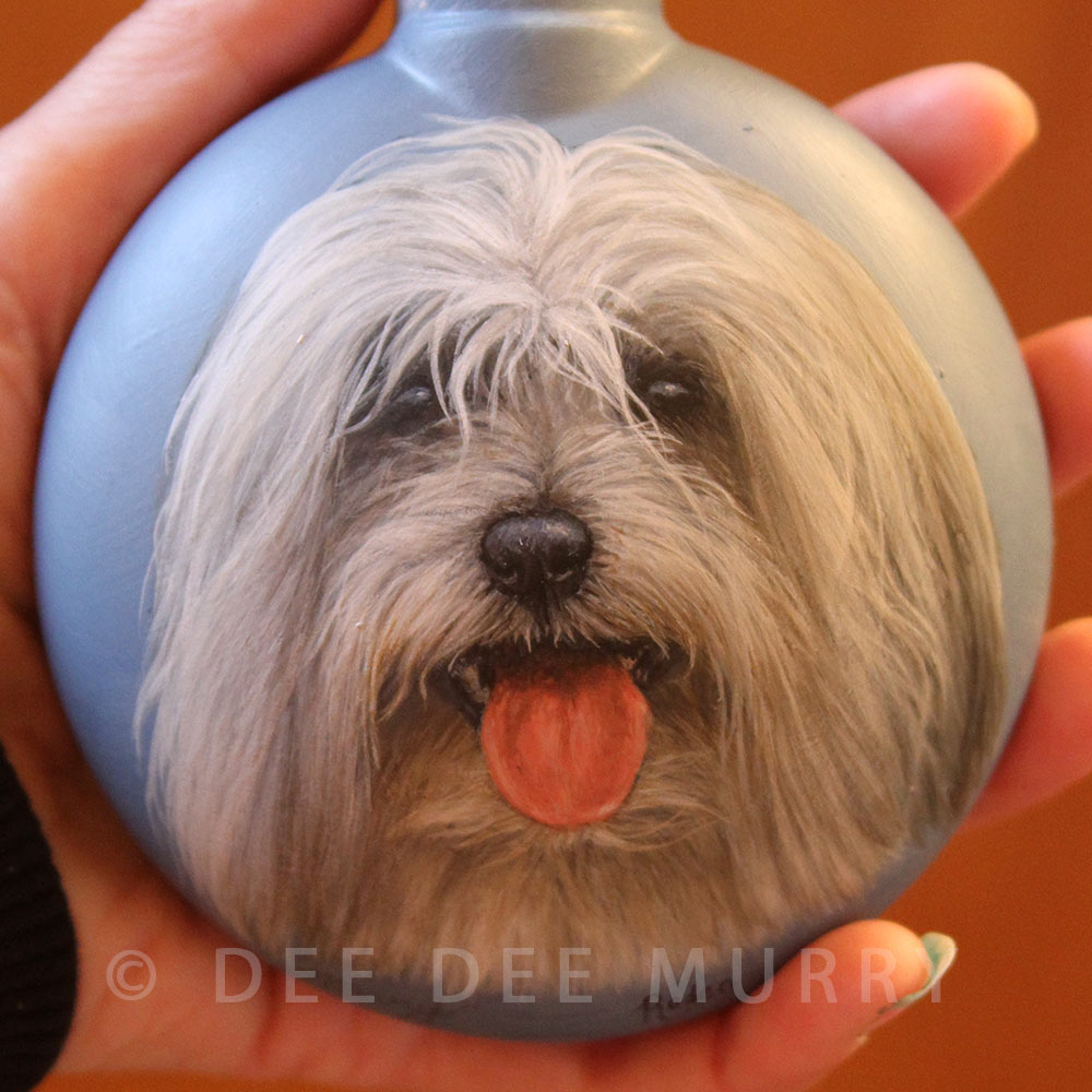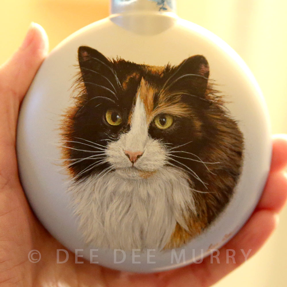 Each pet is meticulously painted on a 4” shatter proof ornament base and comes with a bow on the hanger. Each ornament takes between 25-35 hours to complete. I strive to capture every nuance and detail that makes your pet truly one of a kind.