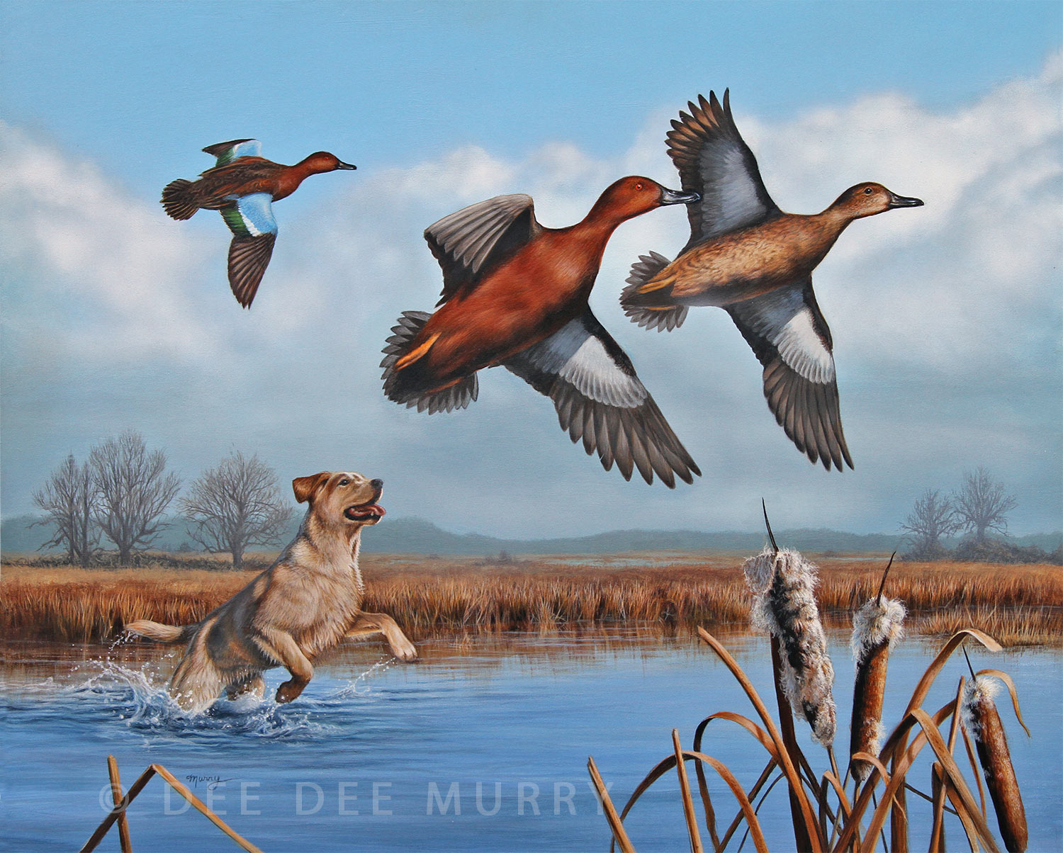 This 18 x 24 acrylic painting of a young yellow Lab having fun with Cinnamon Teal was featured on the 2017 Washington State Duck Stamp.